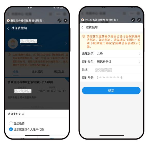 注意:浙江省职工基本医疗保险参保人员已为近亲属建立家庭共济绑定关系的,并且医保个人账户历年余额充足,可在支付时选择“近亲属医保个人账户代缴”支付方式,确认亲属关系无误后点击确定,即可完成共济代缴。